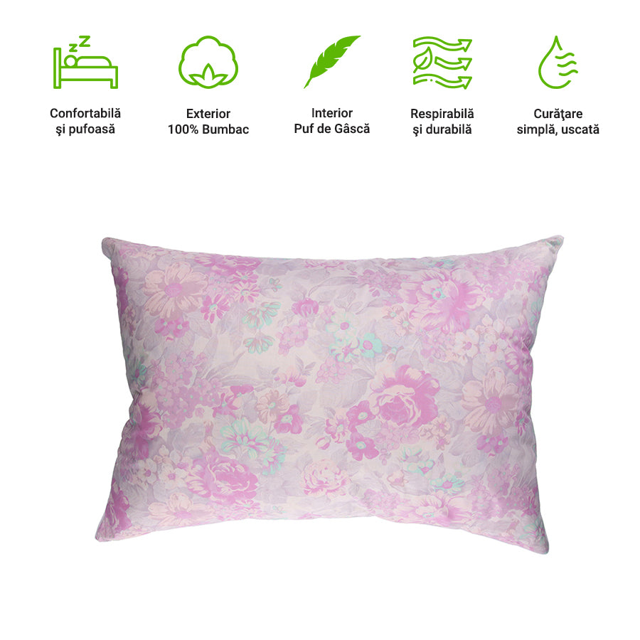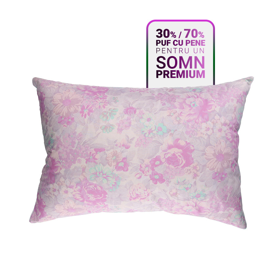 Perna Ferma HappyNest, Înflorată, Lila, 30% Puf de Gasca, 50/70 cm, Tip Clasic