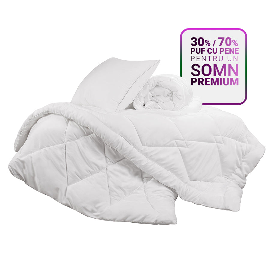 - Amestecul de puf si pene ofera suport usor mai ferm si o senzatie de stabilitate pentru cei care prefera o pilota cu mai multa textura.